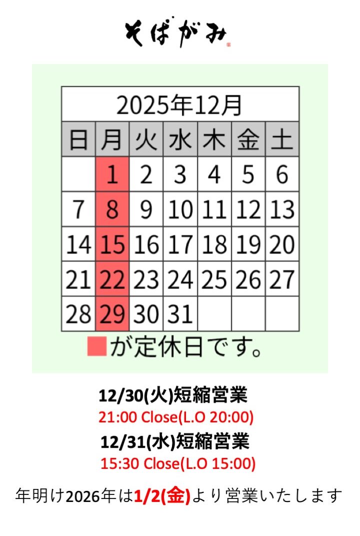 誠に勝手ながら、当店の年末年始休業期間を下記の通りとさせていただきます。