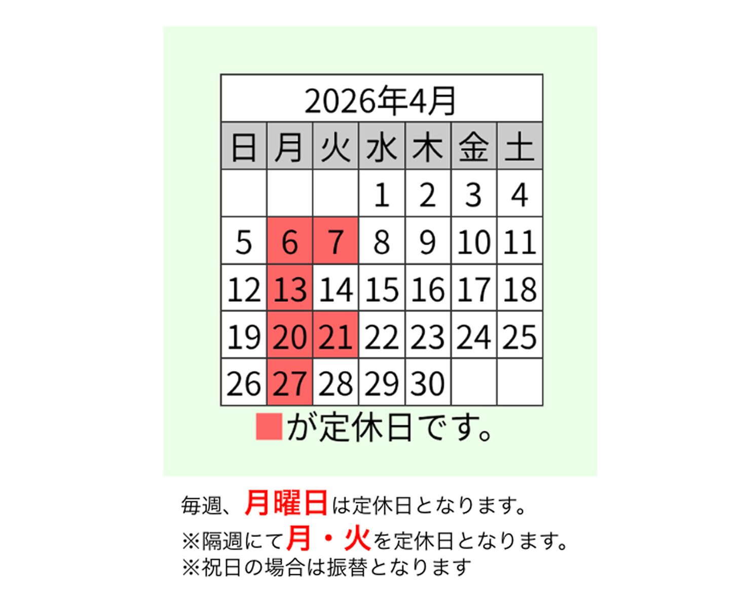 ※第一、第三の週は「月曜日」「火曜日」が定休日となります。